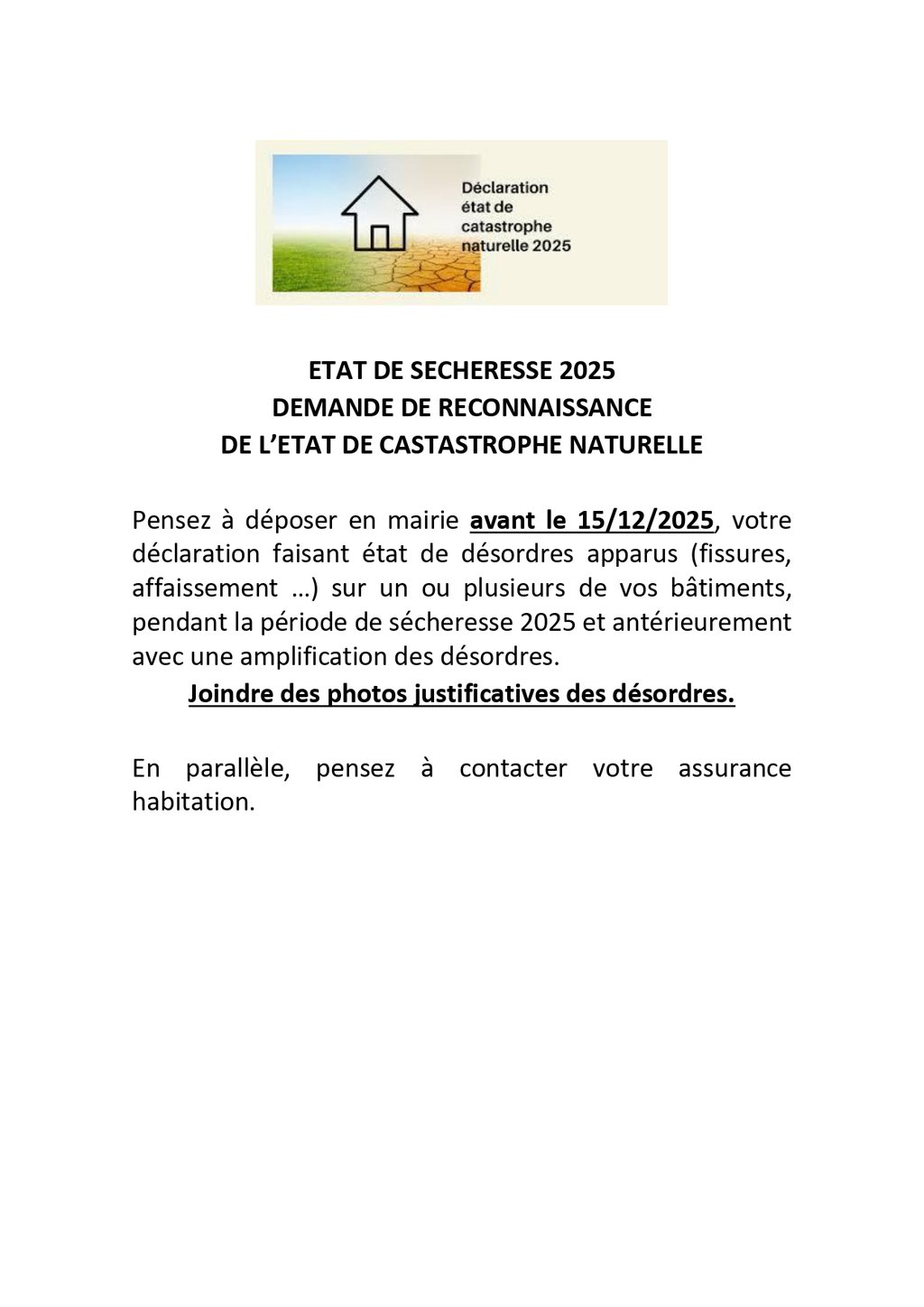 Pensez à déposer en mairie avant le 15/12/2025, votre déclaration faisant état de désordres